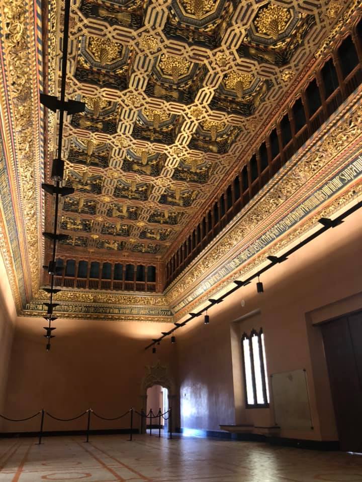 Nous avons ensuite pu visiter le palais de la Aljaferia. Il ‘agit d’un palais arabe du 11ème siècle. A l’époque, il a été réaménagé pour les rois d’Aragon puis les rois catholiques, affectés aux services de l’Inquisition, avant d’être abandonné, puis restauré. Il est aujourd’hui occupé par le Parlement aragonais. Ce palais est tout bonnement magnifique, de par son architecture, en passant par son très beau petit jardin, et toutes ses moulures extrêmement travaillées aux plafonds. L’entrée ici est aussi payante, 5€ par personne, avec la possibilité de faire la visite seule, où de la faire groupée, en bénéficiant d’un guide.